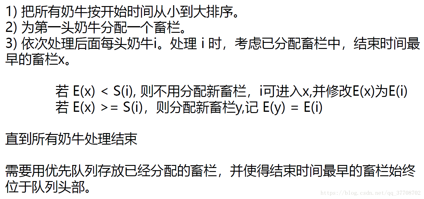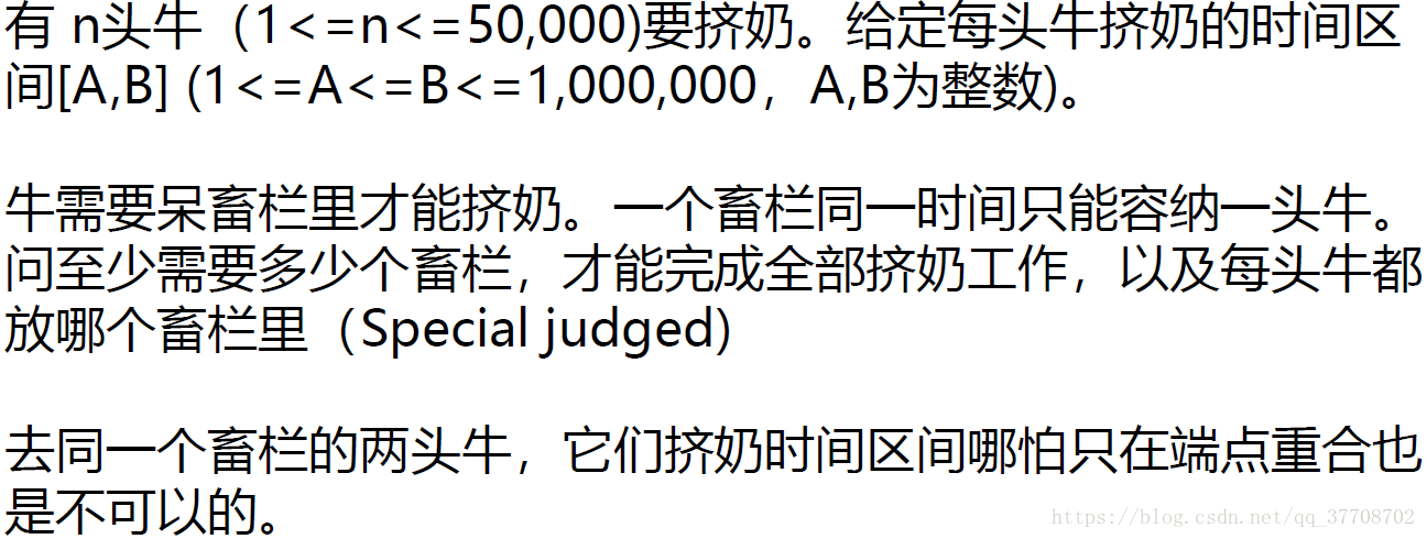 Stall Reservations Description Oh those picky N (1 <= N <= 50,000) cows! They are so picky that each one will only be milked over some precise time interval A…B (1 <= A <= B <= 1,000,000), which includes both times A and B. Obviously, FJ must create a reservation system to determine which stall each cow can be assigned for her milking time. Of course, no cow will share such a private moment with other cows. Help FJ by determining: The minimum number of stalls required in the barn so that each cow can have her private milking period An assignment of cows to these stalls over time Many answers are correct for each test dataset; a program will grade your answer.